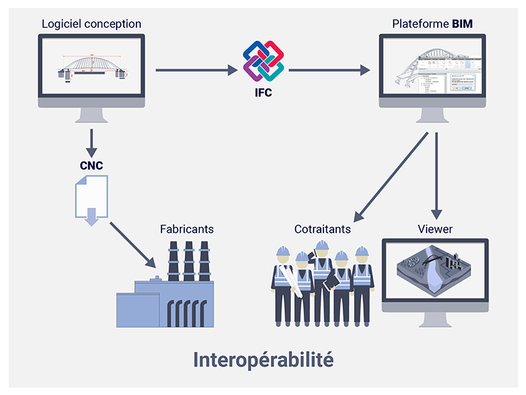 L’interopérabilité est l’habilité d’échanger des informations structurées entre les différentes applications BIM, idéalement sans vérification manuelle pour en garantir la fiabilité. Elle est capitale pour le BIM, dont la collaboration est un des piliers. Comme il n’est pas possible de demander à tous les intervenants d’un projet d’utiliser les mêmes applications, les données doivent bien être échangées.