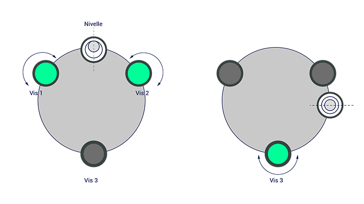 - Étape 1 : s’assurer que les vis calantes sont positionnées à mi-hauteur pour disposer de la plus grande marge de réglage.