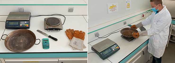 Allumer le réchaud et « cuire » le sol en le mélangeant jusqu’à obtenir un mélange poudreux et totalement sec (en laboratoire, on évapore l’humidité du sol en le plaçant 24 heures dans une étuve à 105 °).