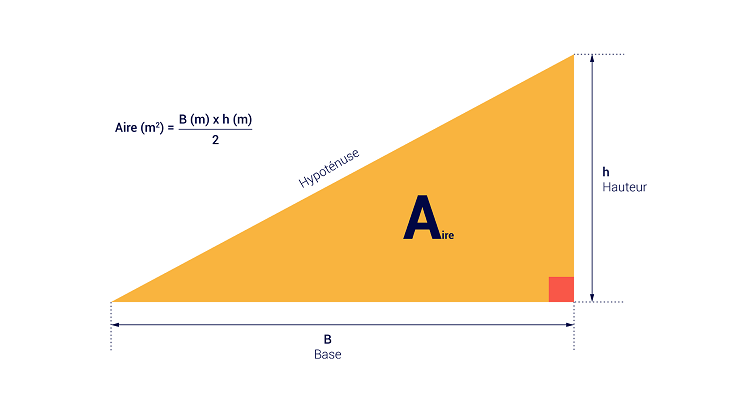 Pour calculer l’aire d’un triangle rectangle, il convient de mesurer la base et la hauteur (les 2 côtés qui forment l’angle droit), de les multiplier entre elles et de diviser le résultat obtenu par 2.