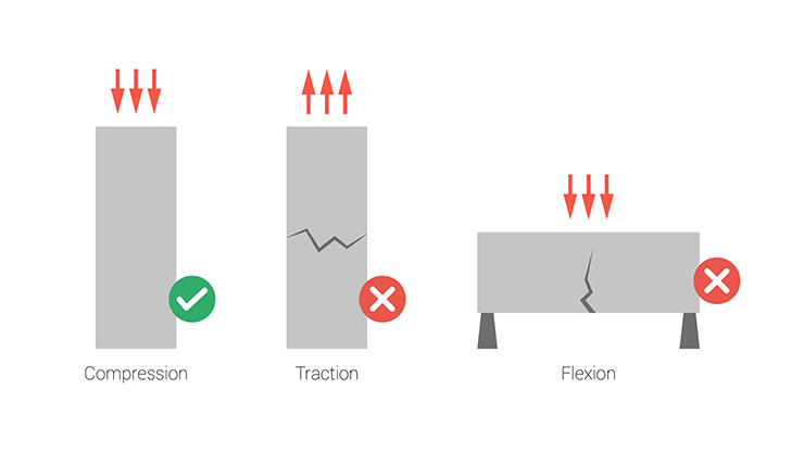 Le béton, constitué à base de ciment, est très robuste à la compression. Mais il est fragile à la traction et à la flexion.