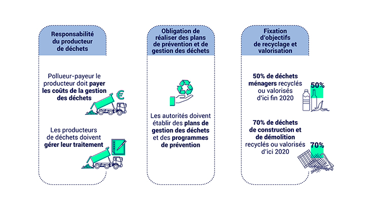 Le paquet économie circulaire a été publié au Journal officiel de l’Union européenne (JOUE) du 14 juin 2018. Il s’agit de quatre directives concernant les déchets :