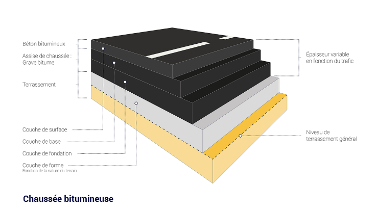 - Les chaussées bitumineuses épaisses disposent d’une assise en matériaux traités aux liants hydrocarbonés sur une épaisseur de 15 à 40 cm, placée sous un revêtement bitumineux. Les matériaux d’assise relativement rigide permettent de répartir les contraintes verticales tout en réduisant les efforts au niveau du support.