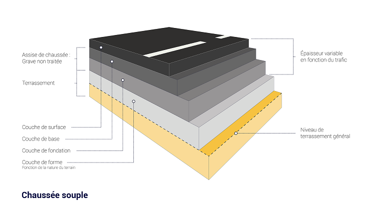 - Les chaussées souples ont une épaisseur comprise entre 30 et 60 cm. Elles se composent d’une couche de surface en matériaux bitumineux, posée sur une assise en matériaux granulaires non traités disposés en une ou plusieurs couches.