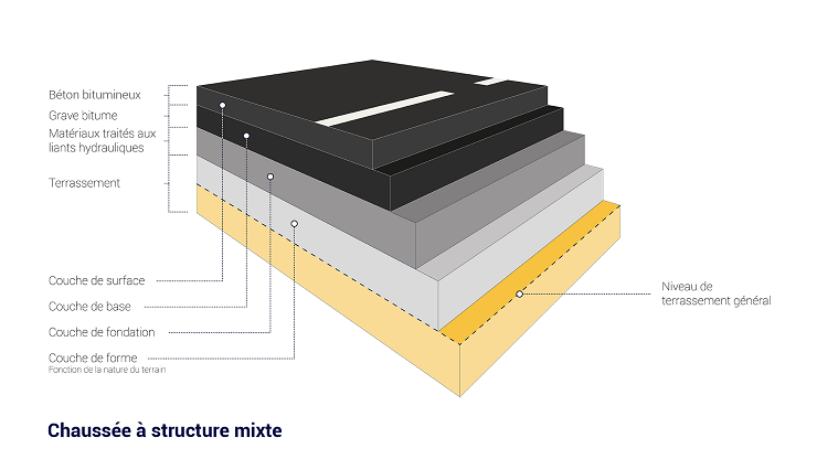 - Les chaussées à structure mixte sont composées de matériaux bitumineux à la fois pour la couche de surface et la couche de base. Ce type de chaussée repose sur une couche de fondation en matériaux traités aux liants hydrauliques permettant de répartir les efforts afin de les atténuer au niveau du support.