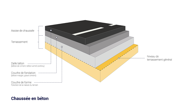 - Les chaussées en béton de ciment sont constituées d’un revêtement en béton pervibré ou fluide. Il s’agit d’une chaussée rigide composée de trois couches : une couche de roulement, une couche de fondation et une couche de forme. La composition de ce type de chaussée assure l’absorption des efforts en limitant leur transmission au niveau du sol support.
