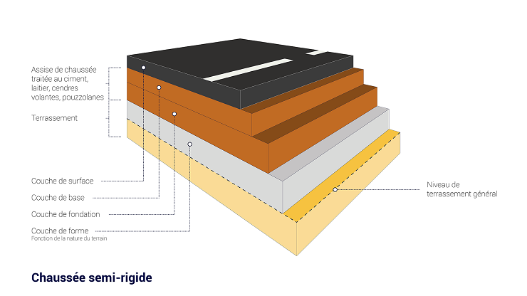 - Les chaussées à assise semi-rigide traitées aux liants hydrauliques comportent une couche de surface bitumineuse posée sur une assise de 20 à 50 cm d’épaisseur en matériaux traités aux liants hydrauliques. Ce type de chaussée présente un fort risque de retraits thermiques qui peut générer des fissures dans sa couche d’assise qui peuvent remonter jusqu’à la couche de surface, entraînant une perte d’étanchéité et, à terme, des crevasses.