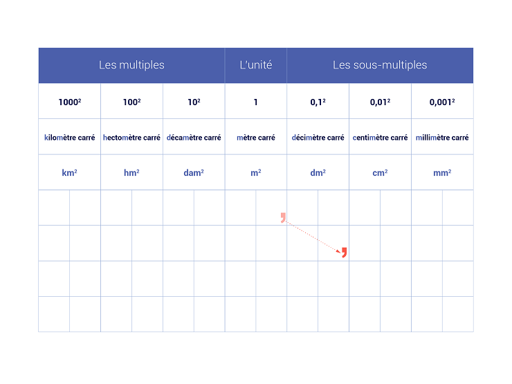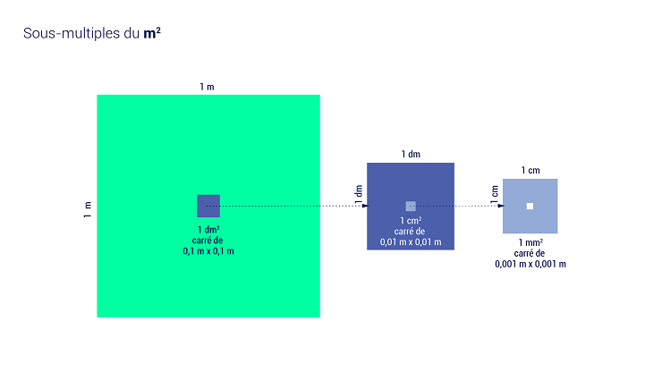 Les unités de surface s’expriment en mètres carrés (m2), déclinée en multiples et sous-multiples, tels que :