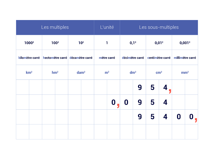 Par exemple, on souhaite convertir 954 cm2 en m2. Pour cela on utilise le tableau comme suit, en complétant éventuellement les colonnes avec des zéros, si nécessaire, sans oublier de placer 2 chiffres par colonne.