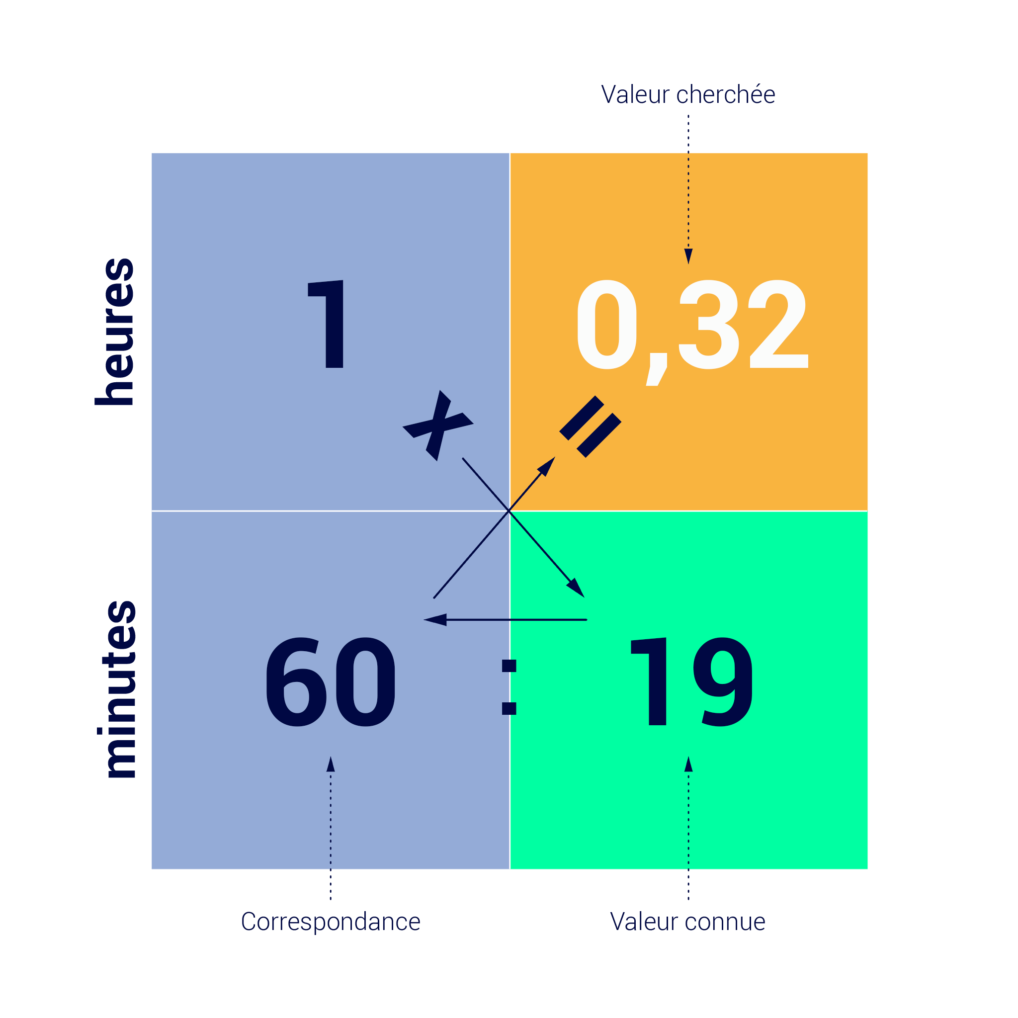 Cette méthode nécessite de maîtriser la technique mathématique de la « 4e proportionnelle » et de savoir que 1 heure = 60 minutes.