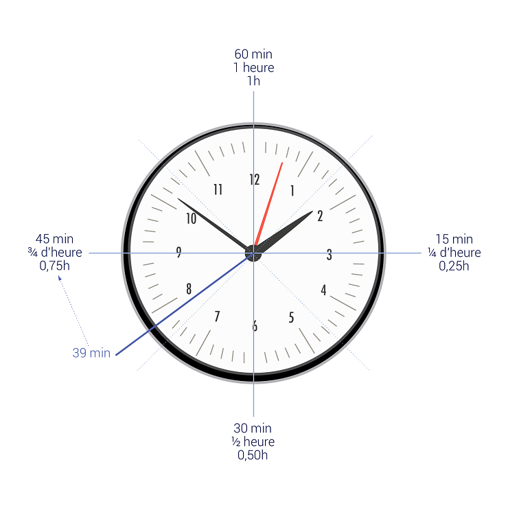 Si par exemple vous relevez une durée de 1 h 39 min et que vous souhaitez la convertir en heures décimales, il suffit de repérer parmi les valeurs 15-30-45 minutes celle qui est la plus proche de votre nombre de minutes. Ici, 39 minutes est plus proche de 45 minutes, que de 30 minutes. 39 minutes correspondent donc approximativement à 0,75 h. Votre durée de 1 h 39 min est donc proche de 1,75 h.