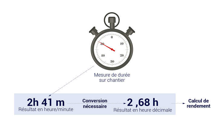 Il est indispensable de maîtriser la conversion d’une durée exprimée en (h)(min)(s), donnée par une montre ou un chronomètre, en une valeur décimale. En effet, les calculs de rendement nécessaires au bon pilotage des chantiers se font à l’aide de durées exprimées en heures décimales. Les durées exprimées en (h)(min)(s) ne sont d’aucune utilité pour les calculs de rendements. Utilisées telles quelles, les durées en (h)(min)(s) induiront des erreurs sur les valeurs de rendement et donc des erreurs sur chantier.