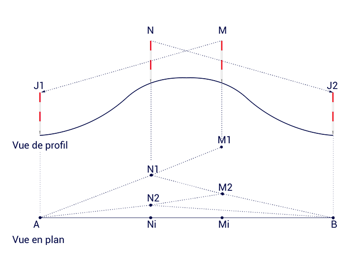 Pour déterminer l’intersection de deux alignements, il suffit de poser des jalons supplémentaires pour réduire la distance de chaque alignement jusqu’à en déterminer le croisement.