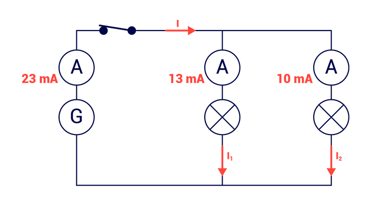 La branche principale se sépare ensuite en deux branches secondaires : la première est traversée par un courant électrique de 13 mA, alors que pour la seconde branche, l’intensité est 10 mA.