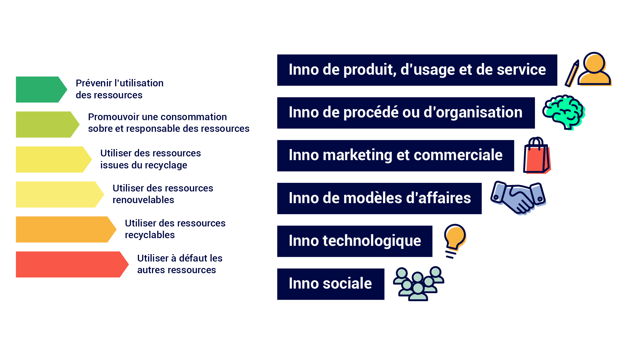 De façon générale, pour intégrer l’économie circulaire, on peut mobiliser des innovations dans 6 domaines différents :